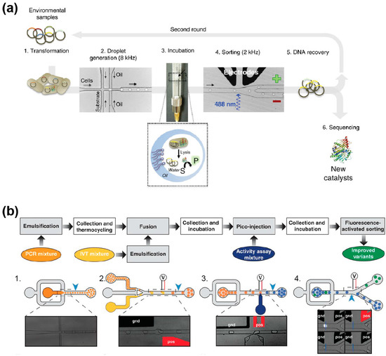 Microfluidic workflow for directed evolution of biological catalysts. (a) Cell-based µIVC screening workflow. Bacteria were transformed with a metagenomic library from an environmental sample (1) and individualized into droplets together with a fluorogenic substrate and a lysis agent (2). Upon collection and incubation in a syringe (3), the emulsion was reinjected into a microfluidic droplet sorter (4), the positive droplets were sorted and the DNA recovered (5). The variants were either analyzed or used for a new round of screening (6). Adapted from [147] under a Creative Commons License. (b) Cell-free µIVC screening workflow. Genes of a library were individualized into PCR droplets (1) and, upon DNA amplification by thermocycling, each droplet was synchronized and fused with a droplet containing an in vitro transcription mixture (2). Once the transcription occurred, a substrate solution was delivered to each droplet by picoinjection (3) prior to a short incubation followed by droplet fluorescence analysis and sort (4). Adapted from [148] under a Creative Commons License.