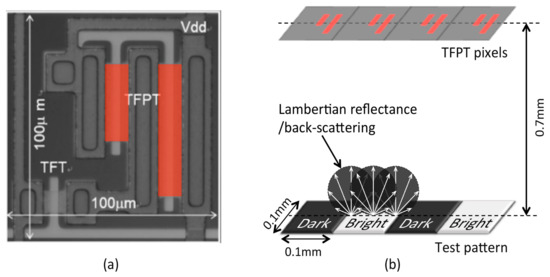 A high-resolution (254 ppi) active-matrix flat-panel imager has been demonstrated using poly-Si thin film photo-transistors (TFPTs), where an FPD is intended to be integrated to form a magnifying viewer [11,12]. The miniature trial product (16 × 16 pixels) of the flat-panel imager is fabricated on a glass substrate. The imager can scan letters of 1 × 1 mm2 font size. However, during the imaging process, the outline of the characters is blurry and image contrast between the background and characters is limited.