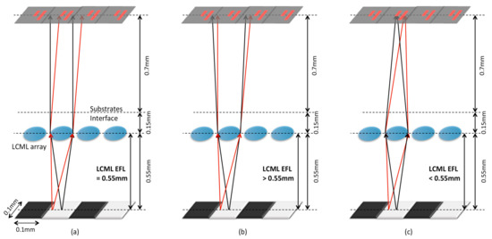 Three scenarios are shown in Figure 2a–c according to the LCML EFL range. When the LCML EFL is ≥0.55 mm, the light beam from a point on paper through the LCML are either collimated or less diverging, and they still land on the neighbouring TFPT pixels as shown in Figure 2a,b and result in a large crosstalk. However, with the LCML EFL < 0.55 mm, more subsequent light beams after the LCML tend to stay within the corresponding pixel and result in less crosstalk, as shown in Figure 2c. To satisfy the EFL range and 0.07 mm LCML diameter, a highly birefringent Nematic LC is recommended for a large phase variation, otherwise a thick layer of LC is needed which results in a long switch-off time. With an LC material of 0.275 birefringence at 550 nm wavelength at room temperature and a layer thickness of ≤10 µm, the fabricated LCML device can achieve EFL down to ~0.2 mm. Simulations are done to evaluate the EFL effect on image contrast, and results are discussed in the next section.