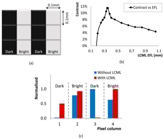 (a) Test object pattern of 4 × 3 square image pixels; (b) Simulated contrast with respect to varying LCML EFL; (c) Normalised light irradiance of the TFPT imager without and with an LCML array.