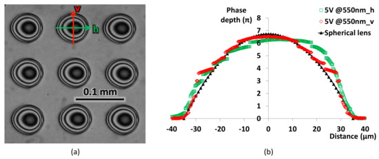The intensity change in the LCML has a good symmetry in the vertical direction (v), and the converted phase depth variation shows a good match to a spherical lens profile, as shown in Figure 4b. In the horizontal direction (h), there is less symmetry in the intensity change; the bright and dark bands on the left half of the LCML are more spread than those on the right half, as shown in Figure 4a. As a result, the converted phase depth variation is more gradual on the left side and matches the spherical lens better than the right side, which has a sharp change between 20 and 35 µm. This non-symmetry in the phase profile is caused by the LC device configuration, especially an angle variation between the rubbing direction and the ITO hole rim, and it is beyond the scope of this study.