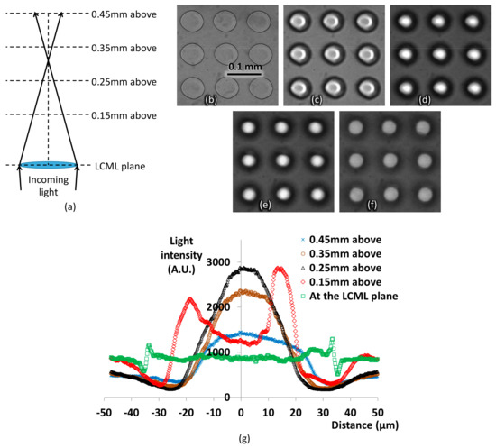 At the LCML plane, the light intensity is roughly the same across the interested region, shown as a uniform grey level in Figure 5b and its line-profile in Figure 5g. As the measurement moves towards 0.25 mm above the LCML plane, the region inside the LCML gets brighter because the light rays are converged to the centre after passing through the LCML. Moving continuously to 0.35 and 0.45 mm above the LCML plane, the peak intensity inside each micro-lens decreases; this is because the focal point of the LCML is passed as shown in Figure 5a. The highest light intensity is observed between 0.25 and 0.35 mm above the LC plane at 510 nm as shown in Figure 5g, which matches the designed EFL (0.34 mm) of the LCML at 550 nm.