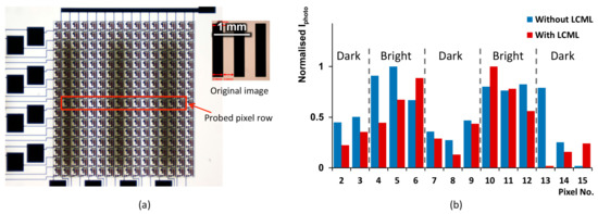 (a) A microscope image of the TFPT imager test setup with a line-pair test pattern of 1.8 lp/mm; (b) Normalised Iphoto values of pixels 2–15 in row No. 9 without and with the LCML array.