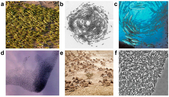 The macroscopic collective behavior of natural animals, such as a herd of land animals, locusts marching, a flock of birds, a colony of army ants, or a school of fish, is a familiar and beautiful part of the living system (Figure 1a–e) [2,35]. The formation of such collective behaviors may be a consequence of an external stimulus or the local interactions between nearby individuals. Taking a school of fish as an example, each individual complies with its behavior on its position and nearest velocity of neighbors. Hundreds of small silver fish glide in unison, much like a single organism than a collection of individuals. Even not a single fish is lost from the group or suddenly change the direction. Such interactions results in a global collective behavior that may emerge, originating and maintaining the cohesion of the aggregate [35,36].