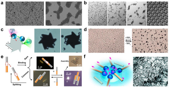 Self-assembled chemical structures produce molecular aggregates with complex functionalities, which are often inspired by biological systems. While self-assembly has been the focus of intense investigation, the disassembly of these molecular aggregates is much less explored, even though it can lead to temporal control over the aggregate functionality. Sen’s group reported a reversible Ag3PO4 microparticle system showing collective behaviors and disassembly in (or without) NH3 medium in Figure 2d [44]. The schooling behavior of Ag3PO4 microparticles was based on self-diffusiophoresis. When adding NH3, the production of large numbers of OH− resulted in faster diffusion away from the Ag3PO4 microparticles than the other ions, and led to exclusionary behavior. When removing NH3, the reaction was reversed, and schooling behavior was observed. The same group also reported an enzyme pump that nanomotors migrated towards regions of higher substrate concentration. The surface-immobilized enzymes, independent of adenosine triphosphate, were functioned as self-powered micropumps in the presence of their respective substrates. The flow was driven by a gradient in fluid density that was generated by the enzymatic reaction. Such behaviors could autonomously deliver proteins and assemble particles in response to specific chemical stimuli [45,46].