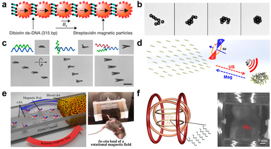 Magnetic field induced swarming and assembly of micro/nanoparticles. (a) Magnetic field Bx guided the particles modified with streptavidin to interact with biotin-modified double-stranded DNA and to form filaments via the specific biotin-streptavidin interaction (reproduced from [64]). (b) Rotating magnetic field Bx + By for colloids assembly (reproduced from [65]). (c) Magnetically assisted assembly and disassembly of microhelices (reproduced from [66]). (d) Complex spatial-temporal collective behaviors of magneto-acoustic hybrid nanomotors (reproduced from [67]). (e) Rotating magnetic nanomotors enhanced the mass transport of t-PA molecules at the blood clot interface for local ischemic stroke therapy (reproduced from [68]). (f) Controlled swimming of a swarm of artificial bacterial flagella in the intra peritoneal cavity of a Balb-C mouse (reproduced from [69]).