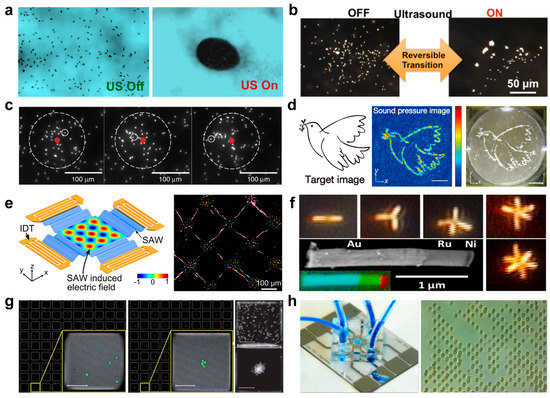 Ultrasound patterned regular geometric graphs have been reported by several groups. Acoustic hologram behavior was investigated, as shown in Figure 5d [11]. The acoustic holograms introduced a monolithic acoustic hologram by using a simple planar transducer driven by a single function generator and amplifier. By modifying the output of a single ultrasonic transducer, a designed 2D phase profile that is generated by the assembled particles can be achieved. Such acoustic induced holograms hold great potential in rapid fabrication of complex sound fields appropriate for super-resolution imaging, selective heating, and personalized medicine. The use of standing surface acoustic waves to trigger nanowires patterning was demonstrated in Figure 5e [74]. Two pairs of parallel interdigital transducers were deposited on a piezoelectric substrate to generate 2D standing surface acoustic waves. With a consistent spacing of half of the wavelength, the polystyrene microspheres were driven to the displacement antinodes, where the nanowires experienced counter-balancing forces from both positive and negative electric charges. Such a hypothesis was also confirmed by adding both silver nanowires and polystyrene microspheres in the 2D standing surface acoustic waves to observe their relative locations. Ultrasound-triggered the self-assembly of nanorod motors into geometrically regular multimers was reported by Mallouk’s group [75]. As demonstrated in Figure 5f, Au-Ru-Ni nanowires (300 nm in diameter, 2.0 μm in length) can assemble into geometrically regular dimers, trimers, and higher multimers under a ~4 MHz of ultrasound at the midpoint of a cylindrical ultrasound cell. Such assembly can be propelled autonomously in fluids by excitation with ~4 MHz of ultrasound and exhibit several distinct modes of motion.