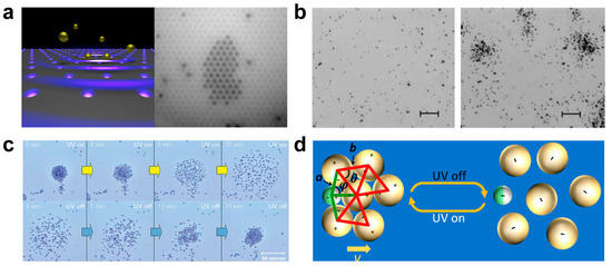 Ibele et al. demonstrated that silver chloride (AgCl) microparticles interacted with each other at high concentrations and formed schools in presence of UV light, as shown in Figure 6b [87]. AgCl microparticles (1 μm in diameter) randomly scattered in deionized water before UV illumination (Figure 6b left). After 90 s of UV irradiation, asymmetric photodecomposition of AgCl microparticles resulted in electrolyte gradient, and led to the collective behavior of AgCl microparticles (Figure 6b right). Similar behavior can also be observed with titanium dioxide (TiO2) microparticles (size range 0.2–2.5 µm), as reported by the same group, as shown in Figure 6c [88]. Under UV illumination, the TiO2 microboats decomposed water and generate electrolyte gradient to trigger the collective behavior of surrounding silica microspheres (2.34 µm), which was unlike AgCl microparticles that photo-decomposed itself to produce the movement.