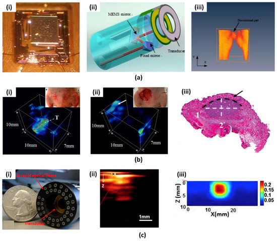 (a) Photoacoustic imaging (PAI) probe based on microelectromechanical system (MEMS) scanning mirror (ai) Photograph of the MEMS mirror (aii) Schematic PAI probe (aiii) 3D rendering of the recovered blood vessels of the human hand [61]. Reproduced with permission from Xi, Lei, et al., photoacoustic imaging based on MEMS mirror scanning; published by OSA, 2010. (b) In vivo volumetric photoacoustic (PA) image of (bi) Tumor before the surgery and (bii) the tumor cavity after surgery. (biii) H & E stained section along the red dashed line in (bi) [62]. Reproduced with permission from Xi, Lei, et al., evaluation of breast tumor margins in vivo with intraoperative photoacoustic imaging; published by OSA, 2012. (c): (ci) integrated optic fibers and ultrasound transducer probe. (cii) Cross-sectional PA image and (ciii) optical tomography (DOT) image of the tumor [63]. Reproduced with permission from Yang, Hao, et al., handheld miniature probe integrating diffuse optical tomography with photoacoustic imaging through a MEMS scanning mirror; published by OSA, 2013.