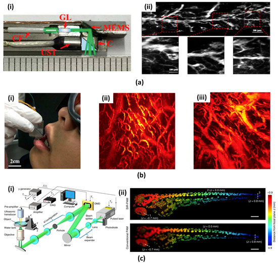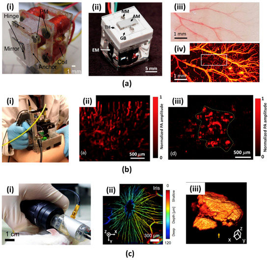 (a) 2-axis water immersible MEMS scanning mirror made of (ai) biaxially-oriented polyethylene terephthalate (BOPET) film and (aii) polydimethylsiloxane (PDMS). (aiii) Photograph of a mouse ear and blood micro-vessels in it. (aiv) PA MAP image of (aiii) [72,77,78]. Reproduced with permission from Huang, Chih-Hsien, et al., a water-immersible 2-axis scanning mirror microsystem for ultrasound andha photoacoustic microscopic imaging applications; published by Springer, 2012. Reproduced with permission from Kim, Jin Young, et al., a PDMS-based 2-axis waterproof scanner for photoacoustic microscopy; published by MDPI, 2015. Fast optical-resolution photoacoustic microscopy using a 2-axis water-proofing MEMS scanner; published by Nature, 2015. (b): (bi) Photograph of the handheld PAM based on 2-axis water immersible MEMS scanner mirror. (bii) PA image of capillaries in a human cuticle. (biii) PA image of the red mole on a human leg [80]. Reproduced with permission from Lin, Li, et al., handheld optical-resolution photoacoustic microscopy; published by SPIE, 2016. (c): (ci) Photograph of the PAM probe. (cii) Depth encoded PA image of the microvasculature in a mouse iris. (ciii) Volumetric PA image of a mole on a human finger [81]. Reproduced with permission from Park, Kyungjin, et al., handheld photoacoustic microscopy probe; published by Nature, 2017.