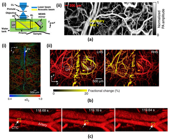 (a) A water immersible MEMS mirror based optical-resolution PAM (OR-PAM). (ai) Schematic diagram. (aii) PA maximum amplitude projection (MAP) image of microvasculature in a mouse ear [74]. Reproduced with permission from Yao, Junjie, et al., wide-field fast-scanning photoacoustic microscopy based on a water-immersible MEMS scanning mirror; published by SPIE, 2012. (b) High-speed functional OR-PAM based on MEMS scanning mirror (bi) Microvasculatures and oxygen saturation level in a mouse brain. (bii) Fractional PA signal changes in response to hindlimb stimulation [75]. Reproduced with permission from Yao, Junjie, et al., high-speed label-free functional photoacoustic microscopy of mouse brain in action; published by Nature, 2015. (c) PA snapshots are showing single circulating tumor cells (CTCs) traveling in the vasculature [76]. Reproduced with permission from He, Yun, et al., in vivo label-free photoacoustic flow cytography and on-the-spot laser killing of single circulating melanoma cells; published by Nature, 2016.