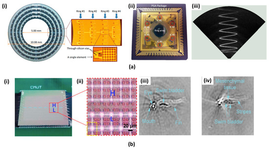 A multi-band CMUT was also fabricated by J. Zhang et al. to visualize the more comprehensive structure of biological tissues [90]. Figure 5(bi,bii) show the photographs and the magnified optical microscopic image of the multi-band CMUT array comprising of low-frequency (~4 MHz central frequency, 10 µm radius) and high-frequency (~10 MHz central frequency, 15 µm radius) arrays. To fabricate the CMUT array, four-inch silicon wafer consisting of the substrate and a lower electrode was prepared. The CMUT and channels were fabricated through a reactive-ion etching (RIE) process with the polysilicon layer and deposition of the Si3N4 layer. Finally, a thin film aluminum of 300 nm was deposited to fabricate an electrode, a connection portion, and a bonding pad. Figure 5b(iii,iv) show the in vivo PA images of zebrafish that were obtained with the multiband CMUT.