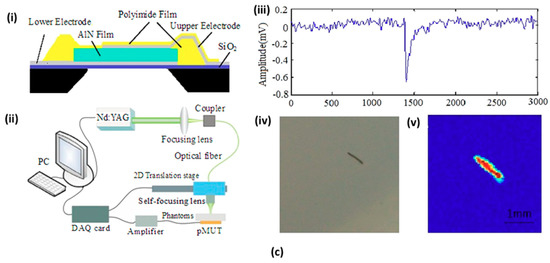B. Chen et al. proposed a new PMUT based on an aluminum nitride (AlN) for PAI applications [98]. As shown in Figure 5(ci), the proposed PMUT has micro-layers comprising of SiO2, lower/top electrodes, AlN, and polyimide (PI) films. The piezoelectric layer based on AlN was generated from metallic Al samples at room temperature via intermediate frequency magnetron reactive sputtering. The AlN based PMUT shows the enhanced SNR due to AlN’s relatively low piezoelectric coefficient. Additionally, its manufacturing process has the benefit of being compatible with the standard ICs. Figure 5(cii) shows the schematic of the PAI experimental setup. A nano-second pulsed laser with 532 nm (Brilliant, QUANTEL) wavelength and was coupled to a mulimodal fiber was excited inside this phantom. The generated PA signal was identified by the PMUT array that was located at the bottom of the phantom. Figure 5(ciii,civ,cv) show one-dimensional PA signal, sample photographs, and reconstructed PA image of human hair within the phantom, respectively. The measured lateral resolution was 240 μm.