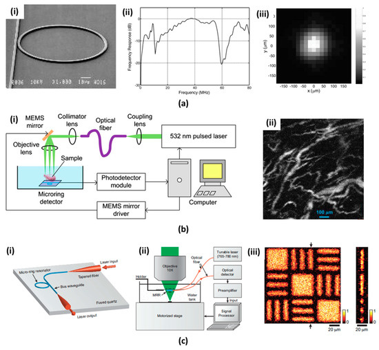 The concept of miniaturized PAI and all optical customized PAI were successfully demonstrated based on MRR’s advantages [64,103,107]. For instance, S.-L. Chen et al. reported the miniaturized PAM probe with MRR detector and MEMS optical scanning mirror. Figure 6(bi) shows the system configuration. A high speed diode-pumped solid-state Nd:YAG laser at 532 nm was directly inserted into an optical fiber and was transferred to a 2-axis MEMS scanning mirror. The MRR detector was located 3.7 mm below the sample surface. System performance was demonstrated by visualizing the microvessels in a mouse bladder with lateral and axial resolutions of 17.5 μm and 20 μm, respectively. Even though these MRRs were investigated on silicon plates, they are not optically transparent. Therefore, only permeable PAI system configurations that are not suitable for scanning thin layered samples were possible. H. Li et al. fabricated an optically transparent US detector that was composed of the MRR on a fine coverslip [108]. Figure 6(ci) shows the customized MRR US detector. The two tapered optical fibers combined with the input and output stages of the ring and bus waveguide simplify the packaging process and improve the coupling efficiency. Due to the optical transparency of the MRR detector, a highly focused laser beam was irradiated on the thin samples via the MRR detector located on the adjustable holder. When compared to the transmission PAI configuration, US deformation was eliminated. The developed MRR US detector has an ultra-wideband frequency range (approx. 140 MHz) and provides an excellent axial resolution of 5.3 μm. A thin film sample was used to obtain a PA image with improved axial resolution and is shown in Figure 6(ciii)).