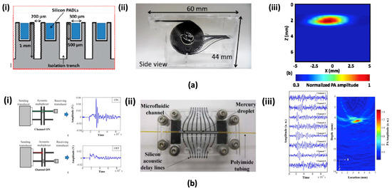 Typical array-type US transducers used in clinical USI and PAI require multiple complex multi-channel DAQ devices to simultaneously receive large amounts of acoustic data from each transducer element [109]. This increases the overall PAI complexity and cost of the system. Recently, the concepts of acoustic time delay were reported by M. K. Yapici et al. [110] to reduce complexity. The parallel connected acoustic delay line receivers were utilized instead of the transducer elements. Each delay line detected the acoustic signal and generated an appropriate delay time so that the signal arrived at a different time on the other side. A single transducer was connected on the opposite side for sensing the time delay signal in series. Thus, the delay line reduces the requirements for multi-element transducer elements and multi-channel DAQ devices. This approach would be more cost effective than conventional US detecting systems. The handheld optical fiber based delay line was investigated as a promising method to take several advantages, such as less acoustic loss, microscale size, flexible property, and low cost [111]. However, in order to generate enough time delay in the optical fiber, a considerable length of optical fiber is required due to the high US velocity in the medium. Moreover, additional attenuation and signal distortion could also occur due to the covered jacket layer. Optimal optical alignment is also necessary to obtain a proper signal and manual assembly. Y. Cho et al. introduced a micromachined silicon acoustic delay line [112]. Thanks to the material property of single crystalline silicon, this method has better transmission efficiency, small size, and more productivity when compared to the optical fiber-based delay lines. Each acoustic channel delivers a single acoustic signal with a specific travel path and delay. To generate sufficient delay length and maintain a compact size, each acoustic channel consists of several U-turns. As shown in Figure 7(ai,aii), 16-channel parallel lines were fabricated by an RIE process using the aluminum pattern mask. All fabricated delay lines were located on the acrylic housing. Since the ultrasonic pulses propagate different lengths from the delay line, they reached the outputs at different times. Figure 7a(iii) shows the acquired two-dimensional PA image from the proposed parallel delay lines. A similar concept was adopted by the same group to micromachined acoustic multiplexer [113]. Only one transmit and/or receive US transducer was required to resolve multichannel signals in this system. Unlike the acoustic delay line, acoustic multiplexer can selectively transmit the acoustic signal via the movement of mercury droplet in microfluidic channel (Figure 7(bi)). The assembled multiplexer is shown in Figure 7(bii). The silicon delay line and multiplexer structure were fabricated by the RIE process. Two PDMS sealing pads were used to form a microchannel with the silicon structure, and the PI microtubing was connected to inlet and outlet of the channel. Mercury droplet was driven by a syringe pump. The PA image of the phantom using this system is shown in Figure 7(biii). A pulse laser illuminated a 5 × 5 mm2 area and the PA signal generated was successfully detected by a single transducer. To collect eight channel signal, illumination and acquisition were repeated eight times.