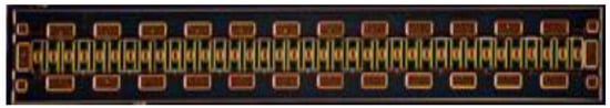 In this work, the GaN HEMT, which is fabricated on a SiC substrate with high thermal conductivity, has a 0.25-μm gate length and operates up to 18 GHz. It has a size of 800 μm × 4800 μm and a saturated output power capability of 70 W at the reference plane of its drain pad. Considering output matching loss, we chose this device for a Ku-band 50 W power amplifier. A photograph of its chip and its main performance parameters are shown in Figure 1 and Table 1 [].