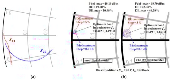Comparison of S-parameter and load-pull simulation results of the conventional large-signal CGHV1J070D model and our modified r7 model: (a) S-parameter simulation; (b) load-pull simulation (left: modified r7 model, right: conventional CGHV1J070D model).