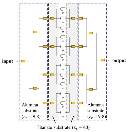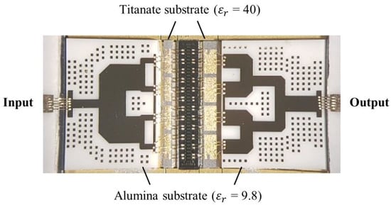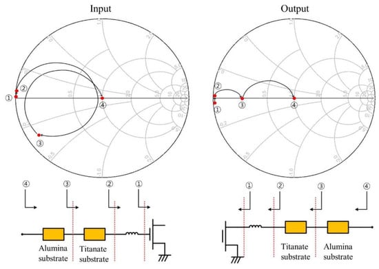 Typically, the optimum source impedance and load impedance of a high-power transistor operating at 10 GHz or above are so small that its impedance matching requires a multi-stage impedance transformer with a high impedance ratio to secure the proper operating bandwidth, which results in a large matching circuit. In the internally-matched power amplifier, which integrates transistor bare dies and thin-film matching circuits in a standard package, a large impedance-transforming matching pattern is not preferable. While maintaining the circuit performance, reducing the size of the matching circuit is essential because of the limited space available in the package. In this work, we use a titanate substrate with a high relative dielectric constant of 40 near the transistor to obtain the impedance matching trace in the low-Q region of the Smith chart and to reduce the size of the matching circuit. The overall input and output matching circuits are fabricated on two different substrates with the relative dielectric constants of 40 and 9.8, respectively. Figure 3 presents a schematic circuit diagram of our Ku-band 50 W GaN HEMT power amplifier.