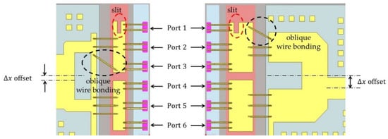 In this work, to obtain amplitude and phase balance at the power-combining point, we apply the asymmetric power combining, which consists of a slit pattern, oblique wire bonding and an asymmetric T-junction, to the matching circuit patterns on the gate and drain sides. The slit is fabricated on a titanate substrate and the oblique wire bonding and asymmetric T-junction are implemented on an alumina substrate. Figure 4 shows the slit, oblique wire bonding and asymmetric T-junction which are applied to 6 transistor cells. The slit is located on the side of the outer transistor cells (ports 1 to 3), and the T-junction is off-center to the inner transistor cells (ports 4 to 6). In addition to the slit and asymmetric T-junction, the oblique wire bonding improves the maximum amplitude imbalance within 0.3 dB and the maximum phase imbalance within 0.2 degree from 16 GHz to 17 GHz.