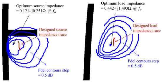 Designed source and load impedance traces overlapped on the simulated source-pull and load-pull contour plots.