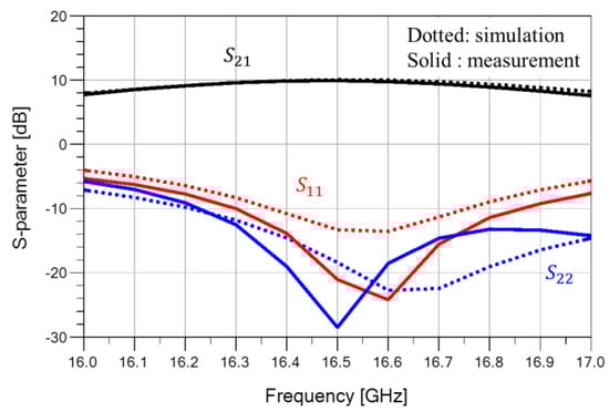 The performance of the fabricated GaN HEMT power amplifier was measured under the bias conditions of VDS = 40 V and IDS = 400 mA. Figure 8 compares the simulated (dotted lines) and measured (solid lines) S-parameter results of the power amplifier. The measured small-signal gain (S21) was more than 8.9 dB and the input return loss was better than 7.7 dB in the range of 16.2 to 16.8 GHz, which was in good agreement with the simulated results.