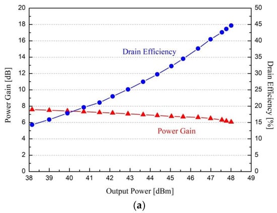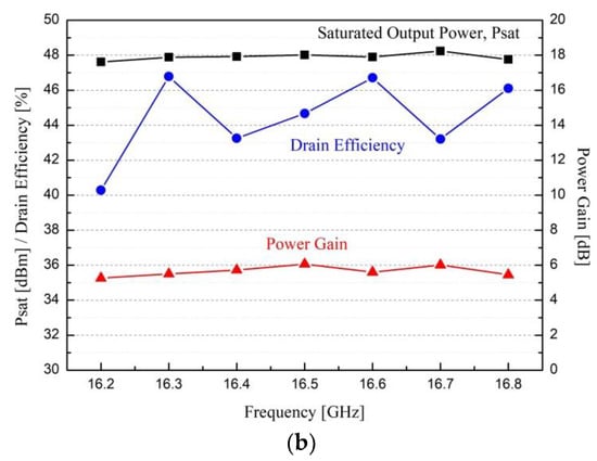 The output power performance of the fabricated power amplifier was measured from 16.2 to 16.8 GHz and is shown in Figure 9. Figure 9a shows the power gain and drain efficiency with the output power at 16.5 GHz and Figure 9b shows the saturated output power, power gain, and drain efficiency with the input signal frequency of 16.2 to 16.8 GHz, under the pulsed measurement with the pulse period of 330 μs and the duty cycle of 6%. The measured output power performance showed the saturated output power of 48.0 dBm (63.2 W), the power gain of 6 dB, and the drain efficiency of 44.6% at 16.5 GHz. From 16.2 to 16.8 GHz, the measured output power was 47.6 to 48.2 dBm (57 to 66 W), and the drain efficiency was 40.3 to 46.7%, while the power gain was 5.3 to 6.0 dB.