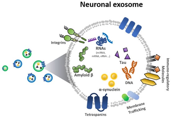 Biological elements in a neuronal exosome, including amyloid-β (Aβ), tau and α-synuclein.