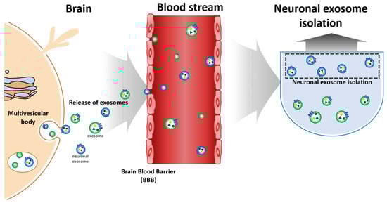 With regard to clinical utility, much effort has been made to validate methods for monitoring neurodegenerative disorders. The exosome has been highlighted for its potential in early stage diagnostics. Nanoscale exosomes (30–150 nm) have been studied to assess proteomic and genetic information about disease diagnostics [14,15]. In particular, neuronal exosomes, as shown in Figure 1, are good candidates for detecting neurodegenerative biomarkers [16,17,18]. Among neurodegenerative biomarkers, Aβ and tau have been considered protein markers of AD and α-synuclein a biomarker of PD (Figure 1).