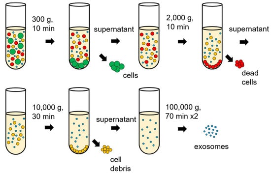 Differential ultracentrifugation is a typical method for exosome separation that uses sequential speed steps of ultracentrifugation (Figure 3). By controlling sequential speeds, the crude homogenate is first centrifuged to sediment cells, dead cells, and cell debris and the resulting pellet is discarded. A classical way to improve exosome purification after differential ultracentrifugation is to isolate the exosome again by ultracentrifugation; in this way, a higher purity is possible, but with a reduced amount of exosome [36,37]. Centrifugation is considered the standard method for separating exosomes from biological fluids/media; however, the major drawback is that the properties of the separated exosomes may depend on the speed of rotation. Moreover, high speeds of rotation can lead to protein aggregation, making results of the Bradford assay less reliable [38]. The efficiency of separation is low and expensive equipment is required to operate differential ultracentrifugation.