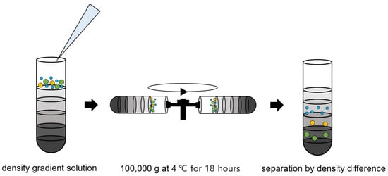 Density gradient ultracentrifugation has recently emerged as a technique for sorting exosomes from biological samples. We showed the density gradient ultracentrifugation process in Figure 4. Density gradient ultracentrifugation is a combination of centrifugation and density gradient and used gradient media, such as sucrose, Nycodenz (iohexol), and iodixanol. Exosomes are isolated via ultracentrifugation to the layer in which the density of the gradient media is equal to that of the exosomes [38,39]. This has the advantage of yielding higher purity because the separations are made according to density rather than size. Other advantages include less protein aggregation, less contamination, and good morphological properties. However, to date, this approach has been limited in its reproducibility, since it is very sensitive to the ultracentrifugation time. Moreover, it requires expensive equipment and stacking and selectively separating layers remains difficult.