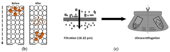 Size exclusion methods. (a) filtration [42], (b) size exclusion chromatography [46], and (c) combination of filtration and ultracentrifugation [45]. Reprinted with permission from [42,45,46].