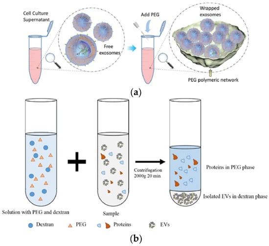 Polymer based exosome isolation of (a) polyethylene glycol (PEG) [52] and (b) aqueous two-phase system (ATPS) [37]. Reprinted with permission from [37,52].