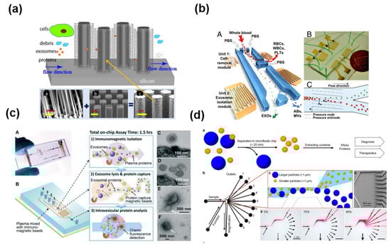 Exosome isolation using microfluidic platform using (a) microstructure [57], (b) acoustic wave [58], (c) immunological separation [60], and (d) size based separation [62]. Reprinted with permission from [57,58,60,62].
