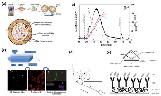 Exosome quantification methods with (a) immunoaffinity capture (IAC) [59], (b) asymmetrical flow field-flow fractionation (AF4) [63], (c) nanoparticle tracking analysis (NTA) [64] (d) dynamic light scattering (DLS) [65], and (e) surface plasmon resonance (SPR) [66]. Reprinted with permission from [59,63,64,66].