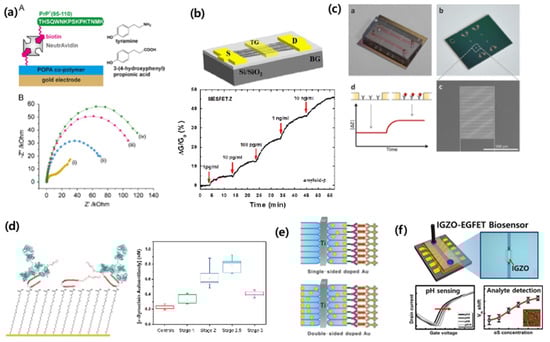 α-synuclein is known to be associated with PD and rheumatoid dementia. Bryan et al. [79] reported an electrochemical detection-based method for the detection of α-synuclein in human blood (Figure 10d,e) [79]. MasaroeÌk [80] also used electrochemical detection to detect α-synuclein, and Yaruien et al. [84] used nanotubes sensors based on photoelectrochemistry to detect α-synuclein. Our group and collaborators also conducted an amorphous indium gallium zinc oxide (IGZO)-based electrolyte-gated field-effect transistor method to detect α-synuclein, and found that this method had a high selectivity and sensitivity (Figure 10f) [81].
