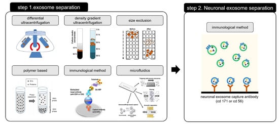 Two-step process requiring for isolating the neuronal exosome. Step 1 for exosome separation [46,49,102] and Step 2 for neuronal exosome separation. Reprinted with permission from [46,49,102].