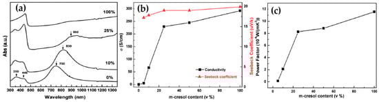 (a) The ultraviolet-visible (UV-vis) spectra of polyaniline (PANi) dissolved in different m-cresol contents, (b) the electrical conductivity and Seebeck coefficient, and (c) the power factor of the polyaniline films prepared with different m-cresol contents. Reprinted with permission from [28]. Copyright 2014 The Royal Society of Chemistry.