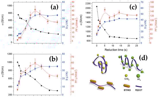 The thermoelectric properties of poly(3,4-ethylenedioxythiophene) (PEDOT):ClO4 (a), PEDOT:PF6 (b), and PEDOT: bis(tifluoromethylsulfonyl)imide (BTFMSI) (c) as a function of chemical reduction time using hydrazine. PEDOT conformation in the presence of different counter-ions (d). Reprinted with permission from [95]. Copyright 2014 The Royal Society of Chemistry.