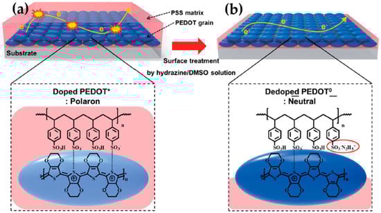 An overall scheme for the spin-coated PEDOT:poly(styrenesulfonate) (PSS) film fabricated by the sequential treatment of p-toluenesulfonic acid monohydrate (TSA)/dimethyl sulfoxide (DMSO) doping and hydrazine/DMSO dedoping. (a) DMSO/TSA-doped PEDOT:PSS film formation via spin coating and selective removal of PSS and the dedoped PEDOT:PSS (DDTP) film treated with hydrazine/DMSO solution (b). Reprinted with permission from [32]. Copyright 2014 The Royal Society of Chemistry.