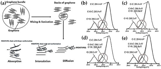 (a) The mechanism of dispersion of aggregated graphene in the polymer (PEDOT:PSS) during mixing and sonication processing. C1s x-ray photoelectron spectroscopy (XPS) peaks of (b) PEDOT:PSS, (c) PEDOT:PSS containing 1 wt% graphene, (d) PEDOT:PSS containing 2 wt% graphene, and (e) PEDOT:PSS containing 3 wt% graphene. Reprinted with permission from [106]. Copyright 2012 The Royal Society of Chemistry.