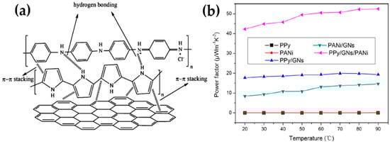 The ternary composites of PPy/GN/PANi synthesized by the combination of the in situ polymerization and solution process exhibited high TE performance, which stemmed from the strong π-π interactions between PPy, GN, and PANi through π-π stacking and hydrogen bonding, as shown in Figure 5a [50]. A uniform coating of PPy on the surface of graphene was achieved from in situ polymerizations, and mixing pure PANi with PPy/GN created the PPy/GN/PANi ternary composites. The highly ordered structure of polymers and the uniform dispersion of graphene in the polymer matrix during polymerization were very beneficial to create numerous interfaces between components, which may cause the increase in the energy filtering and the quantum-confinement effects and consequently enhance the carrier mobility [72]. A highly aligned polymer chain with an ordered molecular structure on the surface of the graphene nanosheets reduced the interchain and intrachain hopping barrier, which significantly lowered the carrier transport resistance. The TE properties were shown to be dramatically improved by combining three components compared to those of two component composites (PANi/GN and PPy/GN), as shown in Figure 5b. At 32 wt% of graphene, PPy/GN/PANi exhibited an electrical conductivity of 500 S∙cm−1 and Seebeck coefficient of 32 µV· K−1, leading to a maximum power factor of 52.5 µW∙m−1∙K−2.