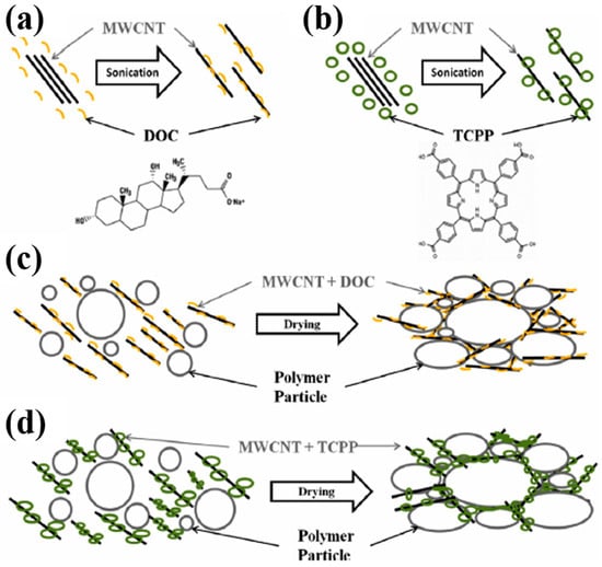 The dispersed multi-walled carbon nanotubes (MWNT), when mixed with polymer emulsion particles, forms a three-dimensional network in the interstitial positions between the polymer particles. (a,b) show representations of the dispersed MWNT in the two stabilizing agents, DOC and TCPP. (c,d) illustrate the formation of a segregated network upon the drying of the water-based polymer emulsions. Reprinted with permission from [54]. Copyright 2012 Elsevier.