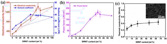 (a) The electrical conductivity and Seebeck coefficient, (b) power factor, and (c) thermal conductivity at room temperature of the PANi/single carbon nanotubes (SWNT) composites. The inset is the SEM image of PANi/SWNT composites with SWNT content of 65 wt%. Reprinted with permission from [61]. Copyright 2016 John Wiley and Sons.
