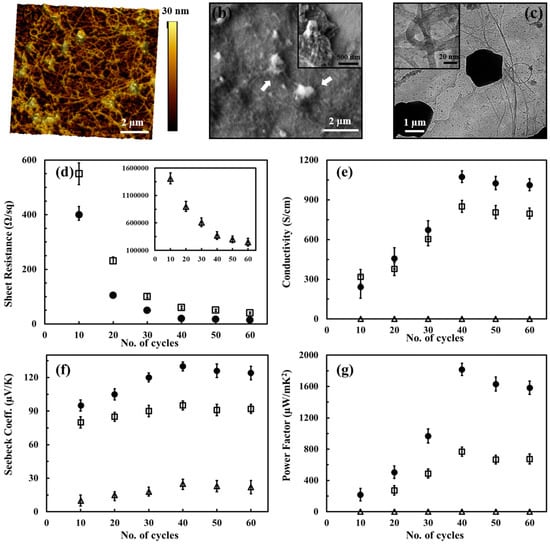 (a) The AFM 3D height image, (b) SEM, and (c) TEM images of the thin films. The insets in the SEM and TEM images show higher resolution graphene platelets and DWNT, respectively. The arrows indicate graphene in the film. (d) Sheet resistance, (e) electrical conductivity, (f) seebeck coefficient, and (g) power factor of PANi/graphene (open triangles), PANi/DWNT (open squares), and PANi/graphene/PANi/DWNT (filled circles) as a function of bilayers or quadlayers (i.e., cycles) deposited on a poly(ethylene terephthalate) (PET) substrate. Reprinted with permission from [76]. Copyright 2015 John Wiley and Sons.