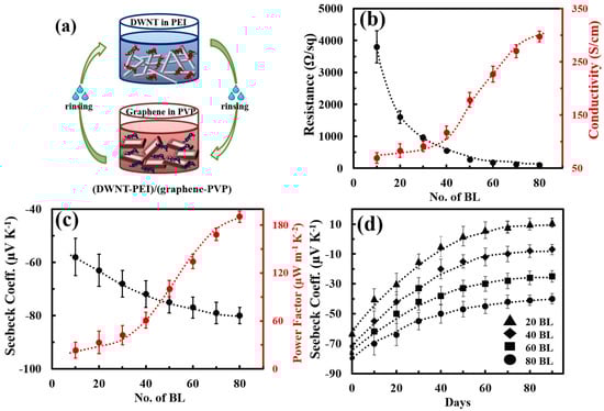 By replacing all insulating stabilizers (PSS and SDBS) with water-soluble (or dispersible) intrinsically conductive polymers, PEDOT:PSS, an 80 quadlayer thin film (≈1 μm thick), comprised of a PANi/graphene-PEDOT:PSS/PANi/DWNT-PEDOT:PSS repeating sequence, exhibited an unprecedented electrical conductivity of 1.9 × 103 S∙cm−1 and a Seebeck coefficient of 120 μV∙K−1 [77] These two values yielded a power factor of 2710 µW∙m−1∙K−2.