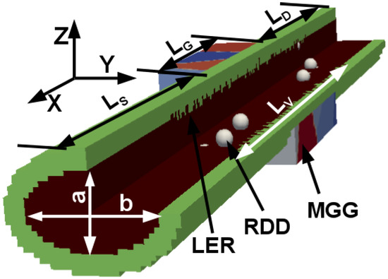 Schematic diagram of the elliptical gate-all-around nanowire metal-oxide-semiconductor field-effect transistors (GAA NWFET) (a = 3 nm and b = 5 nm) highlighting variability sources. For the square and circular nanowires (NWs), a = b = 5 nm. = = 28 nm, = 10 nm, and = 26 nm. The doping concentrations in source/drain and channel regions are 1020 (n-type) and 1015 (p-type) cm−3, respectively. RDD–random discrete dopants, LER–line edge roughness and MGG–metal gate granularity.