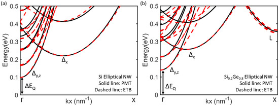In order to model the conduction band for the transport simulation, the PEM Hamiltonian is adopted with transport and confinement effective masses extracted from ETB method with Boykin’s parameter set, implemented in Synopsys QuantumATK [31,32]. For materials, virtual crystal approximation is used [33]. Figure 2 shows the conduction band structures of Si and NWs as an example. It is highlighted that L-valley is observed in NW but not in Si NW. Moreover, it is found that the quantization energy (), the energy difference of conduction band edges of bulk and NW, of NW is larger than that of Si NW.
