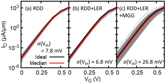Figure 3 shows the statistical transfer characteristics for channel elliptical GAA NWFETs considering different sets of statistical variability sources. The drain current is normalized by the diameter (width) of 5 nm of NWFETs. A statistical ensemble of 200 devices has been used in this work. Significant statistical variability is observed in terms of , and threshold voltage (). Figure 3a,b show that the change in RDD-induced variability when adding LER is small, whereas Figure 3c clearly shows that MGG is the dominant source of variability in the devices under consideration although very small average grain size of 3.0 nm is used. It is also found that the median of subthreshold slope (SS) with RDD, LER, and MGG is 62.8 mV/dec, which is comparable to the value of SS (63.0 mV/dec) for the corresponding ideal device. Standard deviation of SS is 0.78 mV/dec suggesting that SS does not change much due to the impact of statistical variability sources.