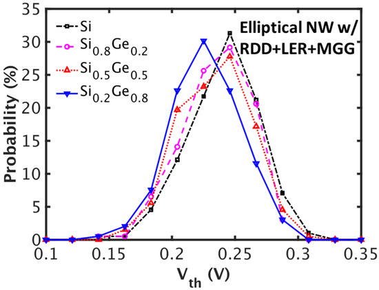 Distributions of threshold voltage () for the elliptical NWFETs with different mole fractions. RDD, LER, and MGG are taken into account.