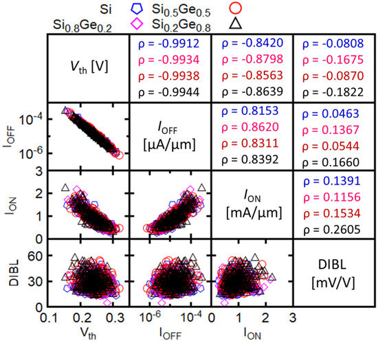 Figure 5 summarizes the correlations between important figures-of-merits (FoMs) in terms of scatter plots and correlation coefficients: , , and DIBL. Herein, is calculated using the constant current method with the current criteria = 100 nA/μm. As data in Figure 5 shows, the correlation coefficients for the different Ge mole fraction are comparable and very similar to those for Si. In addition, as expected, the and show negative correlation with almost equal to 1. Negatively correlated are and with which still has very high value (around −0.85) but less than the value between the and . and show positive correlation with a correlation coefficient close to 0.85. As expected, the DIBL parameter is not correlated to any of the other FoMs, as shown by the value of very close to 0. Hence, our results suggest that replacing Si channel by channel will not solve the variability issues in sub-10 nm gate-length NWFETs.